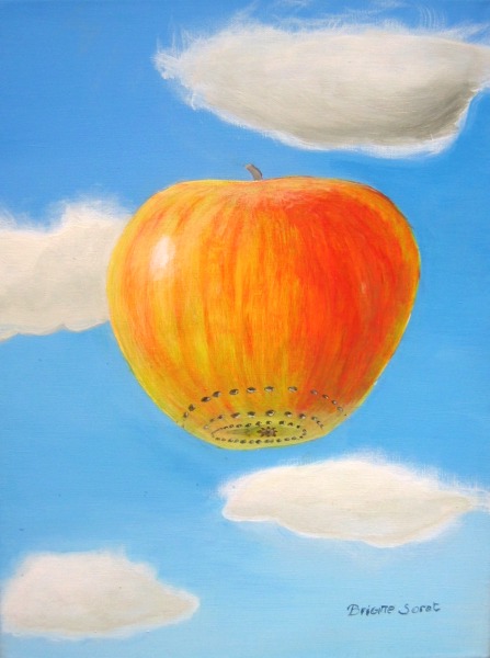 Bon, histoire donc de faire quelque chose avec cet essai réussi de ciel nuageux, et de profiter d'un cours "spécial pommes" du samedi après-midi, Brigitte imagine d'y poser une pomme, façon Magritte. Avouons qu'en premier lieu, et à cause de ce nuage particulièrement gris du haut, elle avait pensé un moment d'y faire flotter une douchette... et puis voilà, éclair de génie : |