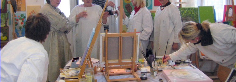 Photos éloquentes : Christine travaille avec fébrilité, intensité, ne perd pas une minute, même lorsque nous prenons une pose ! Il faut avouer que son projet de gros plan sur rose blanche est particulièrement ardu, surtout pour une débutante. L'acrylique n'est pas facile à manier pour appliquer sur la toile des nuances aussi discrètes que celles des pétales de rose. Il faut à la fois être méticuleuse, bien doser ses éclairages, mais aussi, et c'est une révélation que seule une pratique assidue et une détermination sans faille nous permet de constater, il faut quelquefois s'enhardir à des coups de brosse plus larges et enlevés. C'est les variations insensibles de l'appui sur la brosse, en un seul geste, qui permettra sûrement de déposer plus ou moins de peinture. L'acrylique séchant très vite, il faut également pratiquer ces gestes avec vivacité, ne pas laisser la touche se figer si l'on n'est pas satisfaite. Reprendre prestement, après avoir lesté son pinceau de la quantité et de la couleur adéquate. On comprend mieux pourquoi sur les photos Christine apparaît si intensément engagée dans un combat paisible mais sans répits.