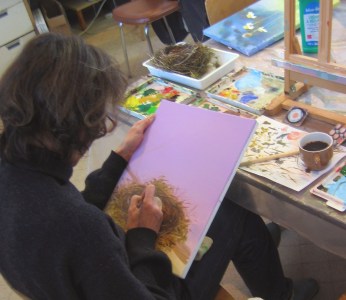 Djanila commence par un nid qu'elle a trouvé sur le sol chez elle, puis ensuite, voguant de concepts en concepts, c'est un petit poème surréaliste qui se compose au grés de son humeur. Chaque élément de la composition est de toutes façons prétexte à apprendre un peu plus la peinture. |