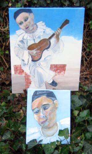 Plusieurs essais sont peints en prévision des paraboles, le projet principal de la saison 2006-2007 à l'Atelier du Pommier. Sylvie essaye des Pierrots (voir à gauche ci-contre), puis des lunes aux regards mystiques, puis des chats. A constater une constance: une petite fascination pour exprimer le regard, que ce soit pour la chouette, les pierrots, la lune, les chats, les fenêtres d'un château, le centre d'une coquille d'escargot, l'agitation paisible des coquelicots. Affaire à suivre.... |