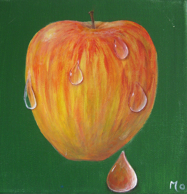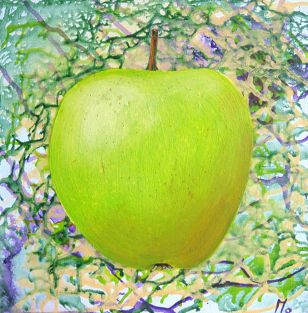 par Acrylique sur toile 55 x 46 cm Madame Cézanne coupant, pêlant une pomme ! Le papier peint olivâtre du fond