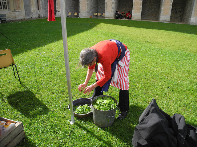 Marie-Claire pose un panier bien rempli de pommes, bonne récolte à cette pauvre eployée de la ferme Saint Siméon.