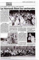 L’Echo le Régional Vendredi 12 août 2011 VEXIN Le Vexin aux couleurs vikings Manifestation contemporaine : des ballots de paille ont été habillés de tissus rayés. Une idée originale et éphémère pour un retour dans le passé lointain. Dans le cadre de la célébration du mille centième anniversaire du traité de paix entre les Vikings et les Francs et en cette période de moissons, les champs ont été mis aux couleurs des explorateurs nordiques et de la Caisse régionale de Crédit agricole de Magny-en-Vexin. C’est ainsi que trois mille mètres de tissus ont habillé les gros ballots de paille, le long de la D14, entre Buhy et les Thilliers-en-Vexin, réunissant ainsi l’Ile-de-France et la Normandie. La Caisse régionale du Crédit Agricole a sponsorisé cette action d’art contemporain mettant en valeur notre monde agricole vexinois. Aventure Land et la commune de Saint-Clair-sur-Epte participaient aussi à cette manifestation d’envergure, animée par le peintre Pierre Marcel et son atelier du Pommier. Il a été aide dans ce travail par Romain et de nombreux bénévoles, les agriculteurs, brefs tout le monde à mis la main … à la paille ! Robert Démard Légende photo 2 : Pas moins de trois mille mètres de tissus habillent les ballots de paille. |