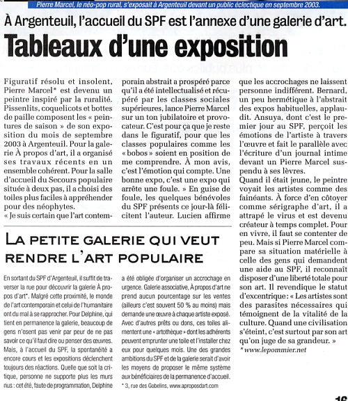 Tableaux d'une exposition (Extraits) Figuratif résolu et insolent, Pierre Marcel est devenu un peintre inspiré par la ruralité. Pissenlits, coquelicots et bottes de paille composent des "peintures de saison" de son exposition de septembre 2003 à Argenteuil. Pour la galerie "A Propos d'Art", il a organisé ses travaux récents en un ensemble cohérent. Pour la salle d'accueil du Secours Populaire situé à deux pas, il a choisi par contre des toiles plus faciles à appréhender pour les néophytes. (ETC...) |