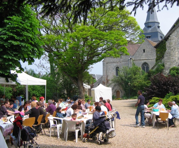 Fred, un volontaire trés volontaire du Secours Populaire, toujours sourires et pleine forme, installe les tables du déjeuner. |