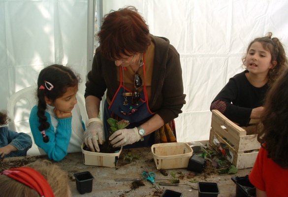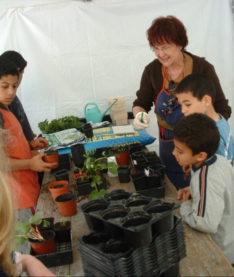 Après avoir visité et prélevé des petites plantes dans les jardins de Saint Clair, (avec l'autorisation des propriétaires, ravis d'expliquer aux jeunes citadins les mystères végétaux) Vivianne et les enfants organisent des plantations à emporter sur les balcons d'Argenteuil. |