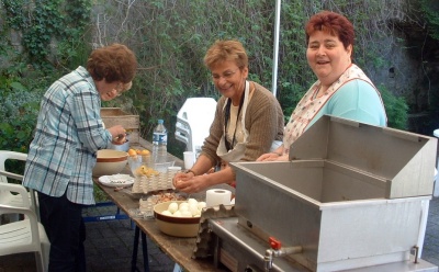 Mr Edmond Marinier fait visiter la cidrerie, et Mr Nicolas Henry, le pomologue, explique le greffage de jeunes pommiers .