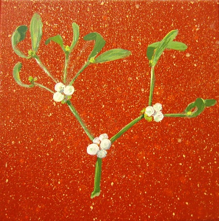 Annie, sans le savoir, avait choisie pour sa compo de gui une couleur assez particulière, un rouille assez difficile à faire, et j'ai constaté en regardant la photo, que c'était la même couleur que son pull ! Bien souvent, lorsque vous êtes embarrassé pour choisir une couleur de fond (qui plus est pour une simple composition d'étude) je propose tout simplement de regarder quelle couleur vous portez sur vous-même. Je pense que si quelqu'un vêt souvent les mêmes assemblages de couleurs, c'est qu'il aime, n'est ce pas, s'y sent bien.