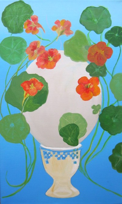 L'idée est venue à Brigitte de transformer sa pomme en pommeau de douche. C'est venu comment ? association d'idée typique de l'atelier du Pommier, et de la vivacité d'esprit des participants à ces ateliers. Il faut dire que Brigitte avait démarré sur les chapeaux de roue, avec sa première peinture Capucine (voir plus haut). A voir également un travail fait par TKI sur les memes séquences d'exploration de l'acrylique: fond de ciel bleu, nuages, ballons.