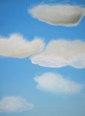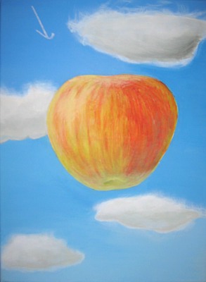 Bon, histoire donc de faire quelque chose avec cet essai réussi de ciel nuageux, et de profiter d'un cours "spécial pommes" du samedi après-midi, Brigitte imagine d'y poser une pomme, façon Magritte. Avouons qu'en premier lieu, et à cause de ce nuage particulièrement gris du haut, elle avait pensé un moment d'y faire flotter une douchette... et puis voilà, éclair de génie : |