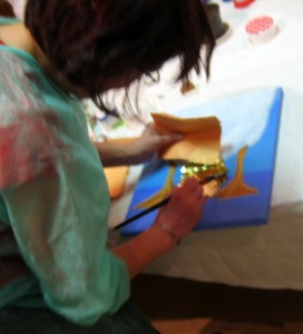 Voilà comment elle s'y prend pour appliquer une feuille dorée sur l'oeuf préalablement enduite de la mixion (colle) |
