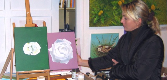Photos éloquentes : Christine travaille avec fébrilité, intensité, ne perd pas une minute, même lorsque nous prenons une pose ! Il faut avouer que son projet de gros plan sur rose blanche est particulièrement ardu, surtout pour une débutante. L'acrylique n'est pas facile à manier pour appliquer sur la toile des nuances aussi discrètes que celles des pétales de rose. Il faut à la fois être méticuleuse, bien doser ses éclairages, mais aussi, et c'est une révélation que seule une pratique assidue et une détermination sans faille nous permet de constater, il faut quelquefois s'enhardir à des coups de brosse plus larges et enlevés. C'est les variations insensibles de l'appui sur la brosse, en un seul geste, qui permettra sûrement de déposer plus ou moins de peinture. L'acrylique séchant très vite, il faut également pratiquer ces gestes avec vivacité, ne pas laisser la touche se figer si l'on n'est pas satisfaite. Reprendre prestement, après avoir lesté son pinceau de la quantité et de la couleur adéquate. On comprend mieux pourquoi sur les photos Christine apparaît si intensément engagée dans un combat paisible mais sans répits.