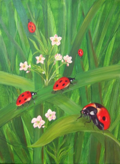 Ce travail sur les coccinelles, à l'origine un exercice de maniement des pinceaux pour faire de longues trainées homogènes (brins d'herbes). On a improvisé, et ce qui était au début un essai est devenu un charmant tableau. La coccinelle sera le thème utilisé par Claudine pour sa parabole, le grand projet de la saison à l'Atelier du Pommier ! |