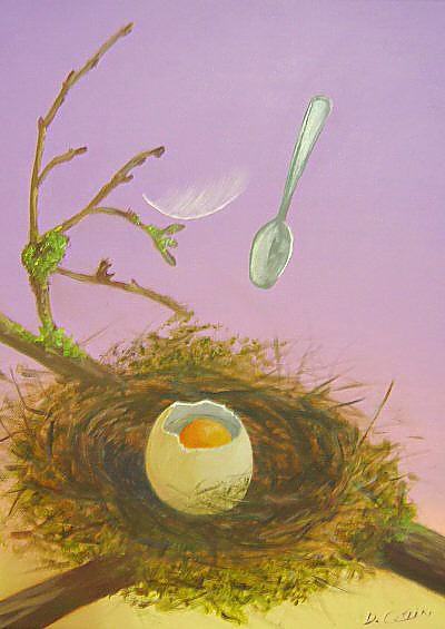 Djanila commence par un nid qu'elle a trouvé sur le sol chez elle, puis ensuite, voguant de concepts en concepts, c'est un petit poème surréaliste qui se compose au grés de son humeur. Chaque élément de la composition est de toutes façons prétexte à apprendre un peu plus la peinture. |