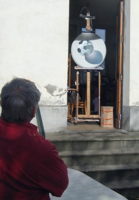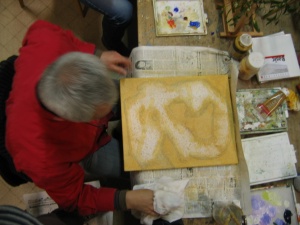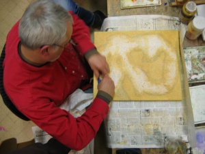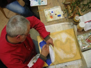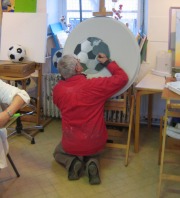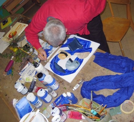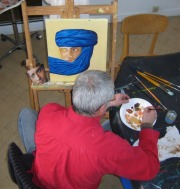 passion, la magie... (le chapeau haut de forme) Sont réunis ici pas mal de difficultés, (plis de tissus, perspectives, effets de matières, sable etc...) et Jean Pierre s'en sort bien, aidé d'une détermination d'acier trempé, et d'une humeur joviale qui fait si grand bien à notre séance du jeudi soir ! Vraiment bien pour quelqu'un dont c'est ici ses premiers pas en peinture, n'est ce pas ?