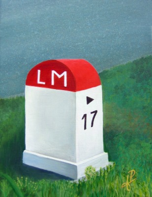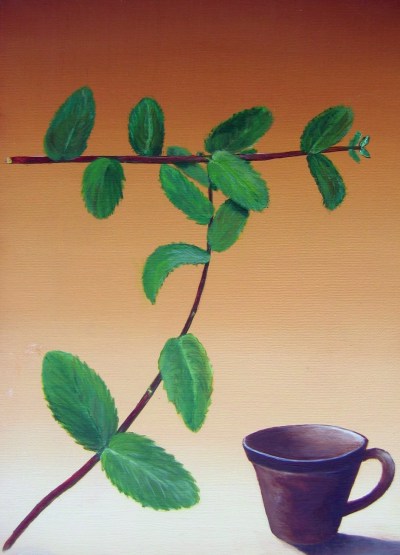 Première peinture de la saison, sur le thème commun à tous pour la rentrée 2006 : les plantes dites médicinales. Le T à la Menthe acrylique sur toile, 27x 46 cm |