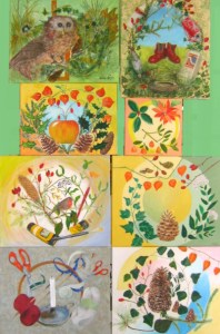 Ce chouette (effraye?) tableau fait partie d'un ensemble d'oeuvres imposées dans le cadre d'un projet de l'atelier (celui de composer des assiettes fantaisies) On voit ci-contre à gauche un ensemble de travaux similaires réalisés à l'atelier. |