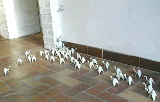 Cette série est accompagnée d’une installation constituée de petits dromadaires obtenus par simple découpage de boîtes à oeufs. Ces modules rigolos, sortes de marqueurs identitaires, renvoient à mon premier travail et participent à son épuisement. Erosion artificielle obtenue, ici encore, par la répétition d’un geste. L’accumulation de ces modules est plutôt un travail rébarbatif mais néanmoins nécessaire au jeu qui m’amuse : jeu de composition utilisant les rapports créés entre les différents éléments et l’espace qui les contient. |