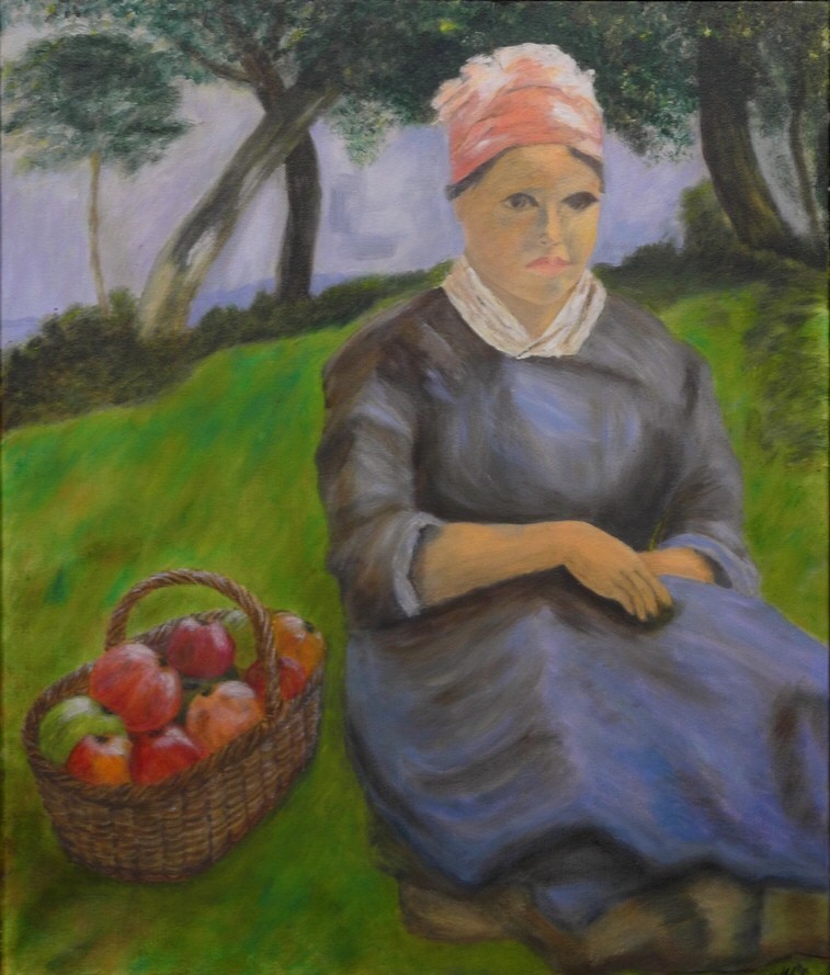 Marie-Claire pose un panier bien rempli de pommes, bonne récolte à cette pauvre eployée de la ferme Saint Siméon.