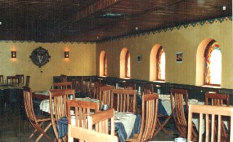 In this other room of Santa Fe restaurant, a simple geometric frise does a lot to give some spark to this dinning room. |