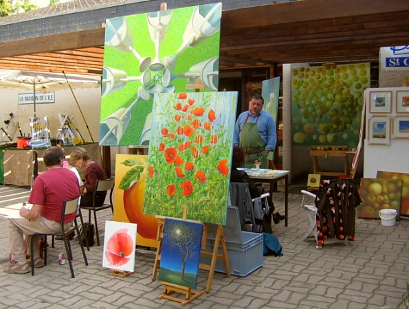Au fond, juste à coté de l'entrée principale de la Maison de l'Ile ou se tenait un marché artisanal, je peins un grand tableau de pommes 1,50 x 1,50 m. Ce panneau est en fait au départ une surface d'entraînement pour mes élèves de l'école du Pommier. |
