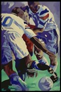 "Les celebrations du sport et de la danse - dernier "rites" de notre époque - nous relient au sacré par les essentiels" que sont le mouvement, le rythme, l'énergie, la couleur... C'est a ce degré que nous pénétrons d' emblée avec Patricia Rabeux. elle sait capter ce coeur de l'action, l'intensité, l'extrême, le point ultime où les apparences s'annulent, elle nous fait franchir l'émotion de surface et nous conduit par le talent le plus direct à la rencontre de l'absolu dans chaque scène figurée. Nous participons à la gloire comme à la sueur nous vivons le dépassement. Face à nous la couleur vibre flamboie devient une masse animée indépendante. Nous sommes instantanément reconduit dans ces moments exceptionnels que nous avons tous vécu et nous reconnaissons alors ce que nous aimons et cherchons au delà de ce que nous voyons. Cette peinture jubilatoire