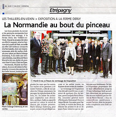 Etrépagny Les bons produits du terroir et les peintures normandes font désormais bon ménage, à la Ferme Derly des Thilliers-en-Vexin. Depuis la semaine dernière en effet le magasin, situé en bordure de la route de paris, accueille en effet 150 tableaux consacrés à la Normandie, dont une impressionnante série de vaches réalisée avec talent par Marie-Solange Dubreucq. A ses côtés une trentaine d’artistes, tous élèves de Pierre Marcel et son Atelier du Pommier basé à Saint Clair sur Epte. Normands, Picards ou franciliens, ils nous dévoilent la Normandie à travers des œuvres de fort belle facture, tous plus originales les unes que les autres. Les vaches et les pommes y côtoient l’histoire, celle de nos ancêtres les Vikings notamment, les paysages, les reproductions de blasons, etc. De même les techniques employées sont diversifiées, acrylique, huile ou aquarelles mettant en valeur le travail de chacun des artistes présents. Marie Solange Dubreucq, pour sa part, avoue n’en privilégier aucune et les utilise toutes, en fonction de ses envies du moment. Le vernissage de l’exposition s’est déroulé mardi 8 mai (2012), en présence de quelques élus du secteur, parmi lesquels Pierre Beaufils, conseiller général maire d’Etrépagny, Emmanuel Hyest et James Blouin. L’occasion pour Pascal Derly, le maître des lieux, de féliciter les artistes et de se réjouir d’une initiative qui ne restera pas sans lendemain. De fait, si l’exposition de tient officiellement jusqu’au 17 mai, la boutique Derly accueillera désormais en permanence des œuvres réalisées par les élèves de Pierre Marcel. « Nous les renouvellerons régulièrement » assure l’artiste, dont les propres toiles compètent cette belle exposition.