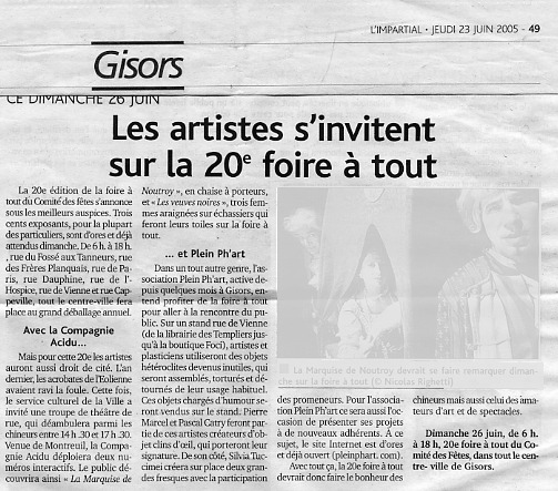 (...) l'association Plein Ph'art, active depuis quelques mois à Gisors, entend profiter de la foire à tout pour aller à la rencontre du public. Sur un stand rue de Vienne (de la librairie des templiers jusqu'à la boutique Foci), artistes et plasticiens utiliseront des objets hétéroclites devenus inutiles, qui seront assemblés, torturés et détournés de leur usage habituel. Ces objets chargés d'humour seront vendus sur le stand. Pierre Marcel, Pascal Catry (et Bernard Pellet NDL) feront partie de ces artistes créateurs d'objets clin d'œil, qui porteront leur signature. De son côté, Sylvie créera sur place deux grandes fresques avec la participation des promeneurs. Pour l'association Plein Ph'art ce sera aussi l'occasion de présenter ses projets à de nouveaux adhérents. A ce sujet, le site Internet est d'ores et déjà ouvert (pleinphart.com) (...) |