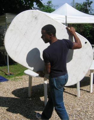Fred, un volontaire trés volontaire du Secours Populaire, toujours sourires et pleine forme, installe les tables du déjeuner. |