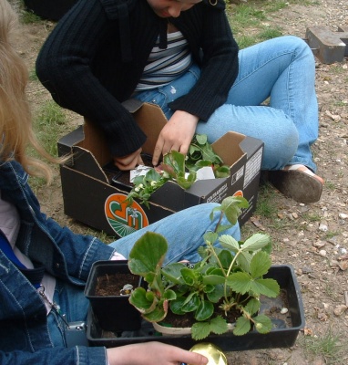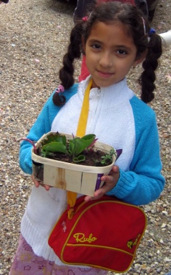 Après avoir visité et prélevé des petites plantes dans les jardins de Saint Clair, (avec l'autorisation des propriétaires, ravis d'expliquer aux jeunes citadins les mystères végétaux) Vivianne et les enfants organisent des plantations à emporter sur les balcons d'Argenteuil. |